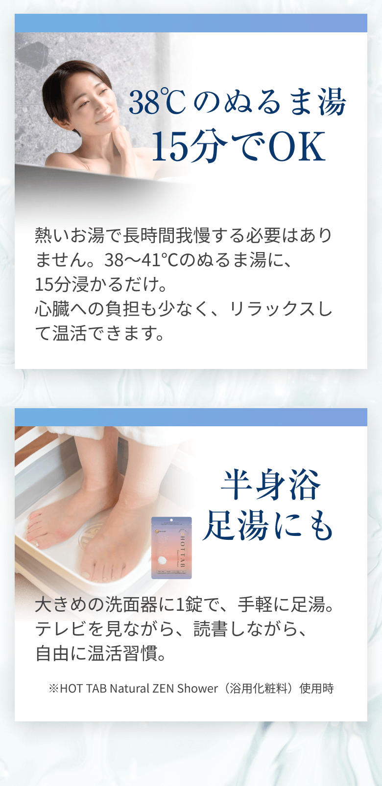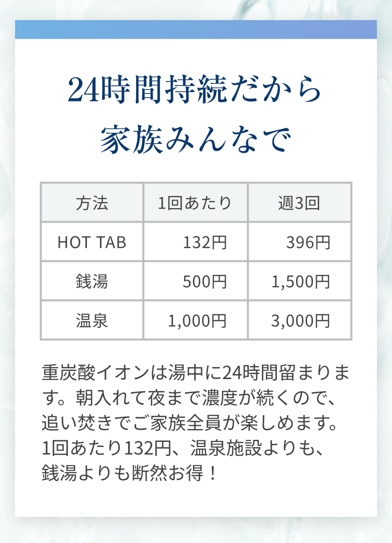 ホットタブ(医薬部外品)の溶けたお湯は中性pHで、重炭酸イオンが湯中に溶け込みます。重炭酸イオン(※有効成分:炭酸水素ナトリウム、炭酸ナトリウム)が温浴効果を高め血行を促進し、冷えなどの諸症状を緩和。湯上り後も温まり感が持続します。