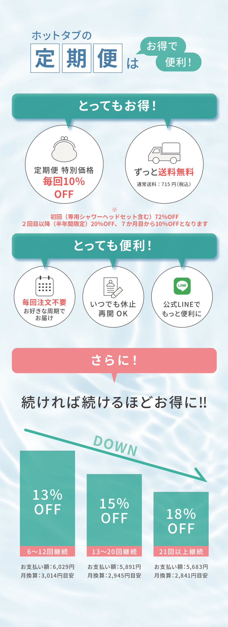 ホットタブをシャワーにセット後、瞬時に重炭酸シャワー浴が楽しめ、じわじわ溶け出たそのパワーが8分間持続。忙しい方でも気軽にホットタブ重炭酸湯を楽しめるよう開発されました。ホットタブシリーズは、入浴や洗顔、洗髪にも使え、目に入ってもしみないのでシャワーでも使うことができます。気になる水道水の残留塩素を中和し、なめらかな肌触りのお湯になります。