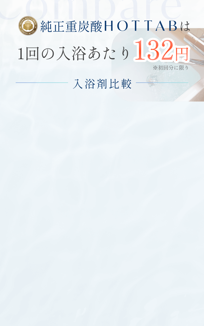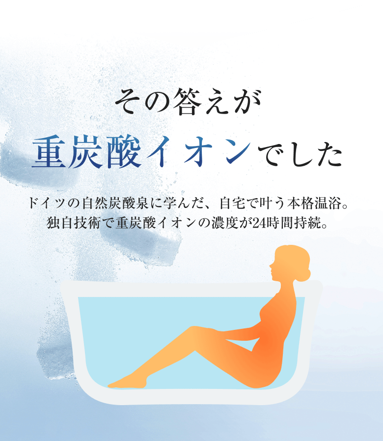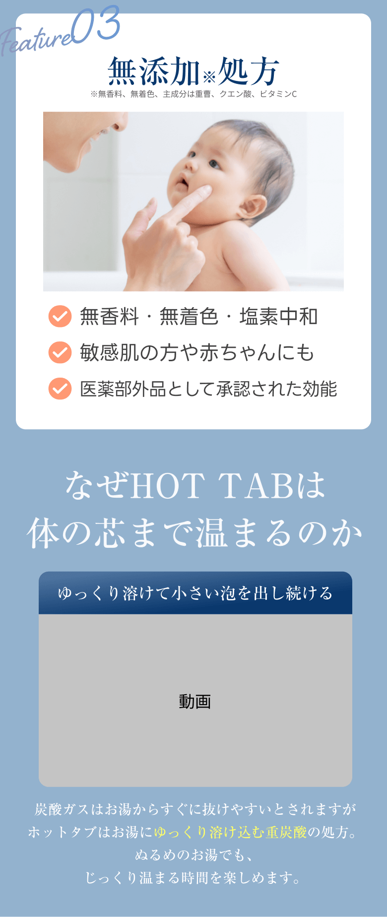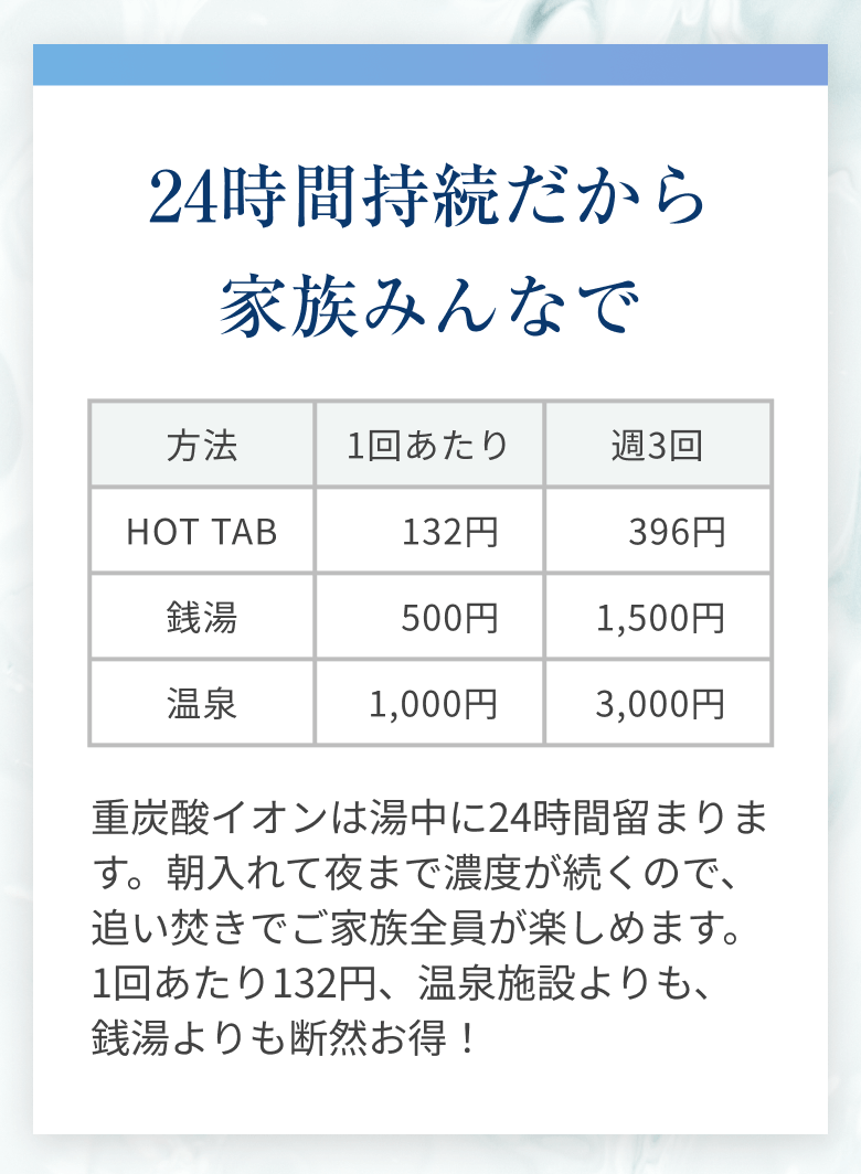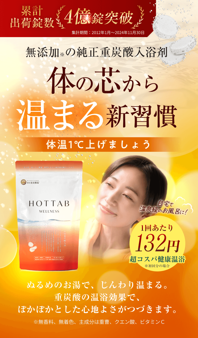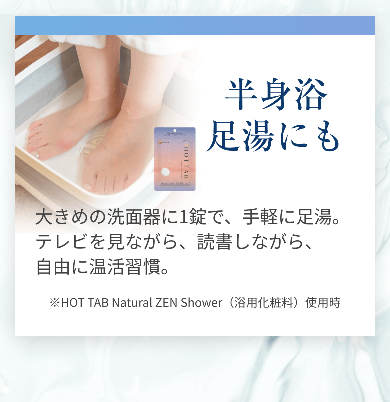 ホットタブ(医薬部外品)の溶けたお湯は中性pHで、重炭酸イオンが湯中に溶け込みます。重炭酸イオン(※有効成分:炭酸水素ナトリウム、炭酸ナトリウム)が温浴効果を高め血行を促進し、冷えなどの諸症状を緩和。湯上り後も温まり感が持続します。