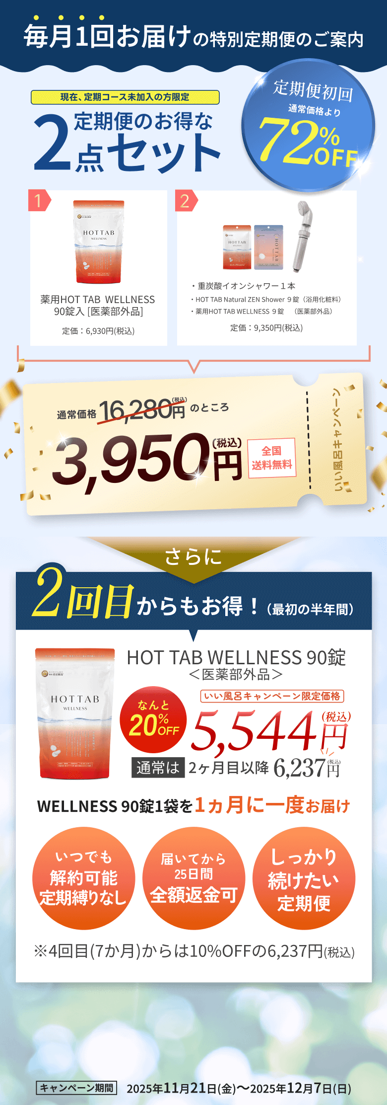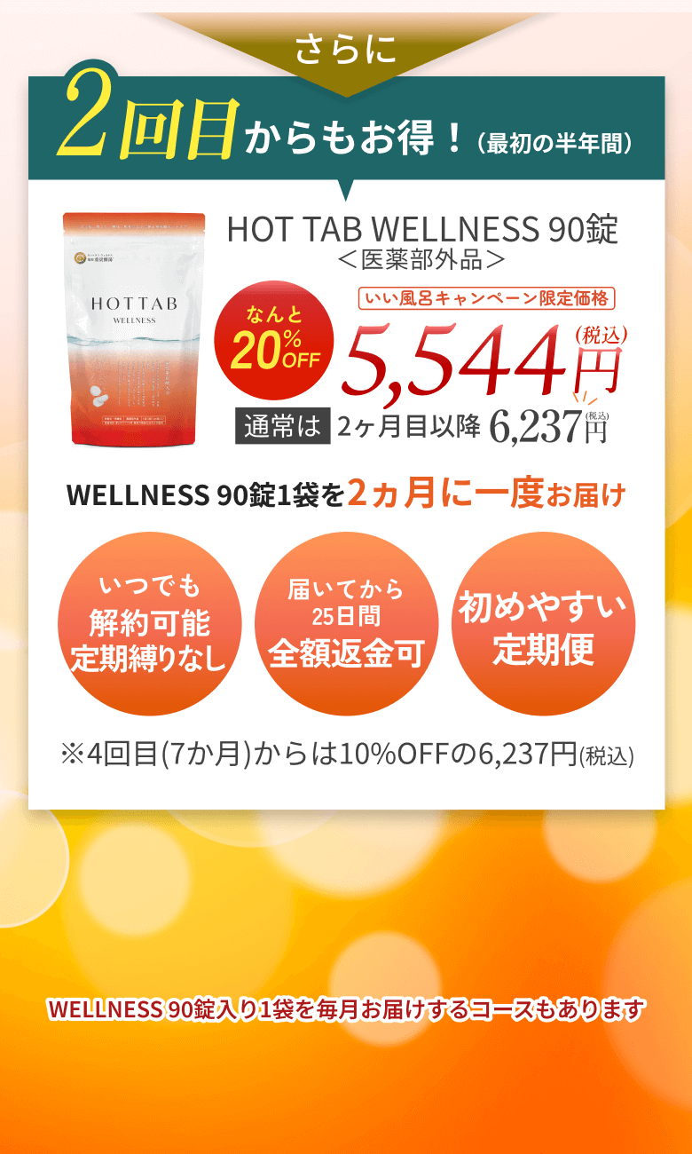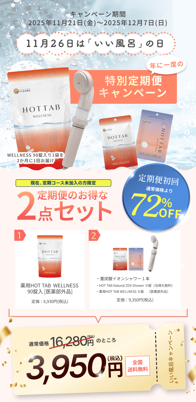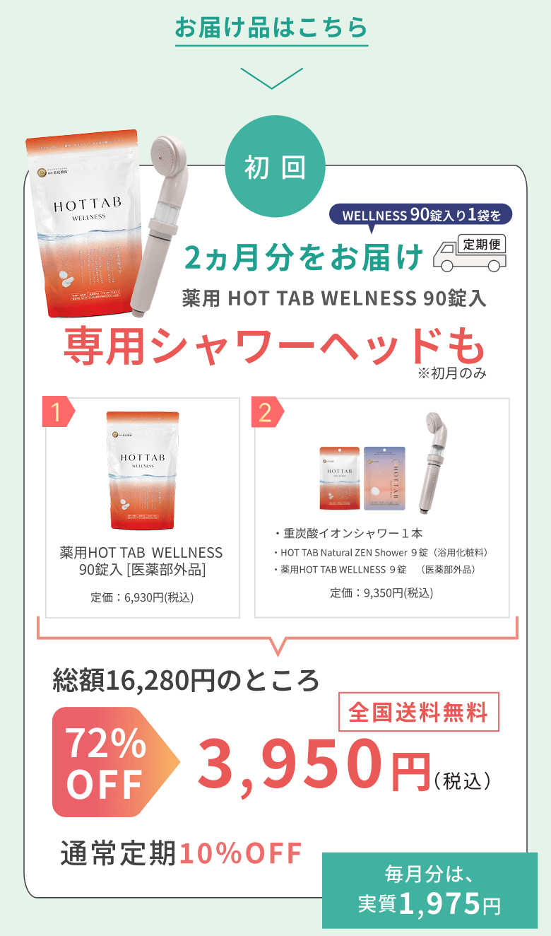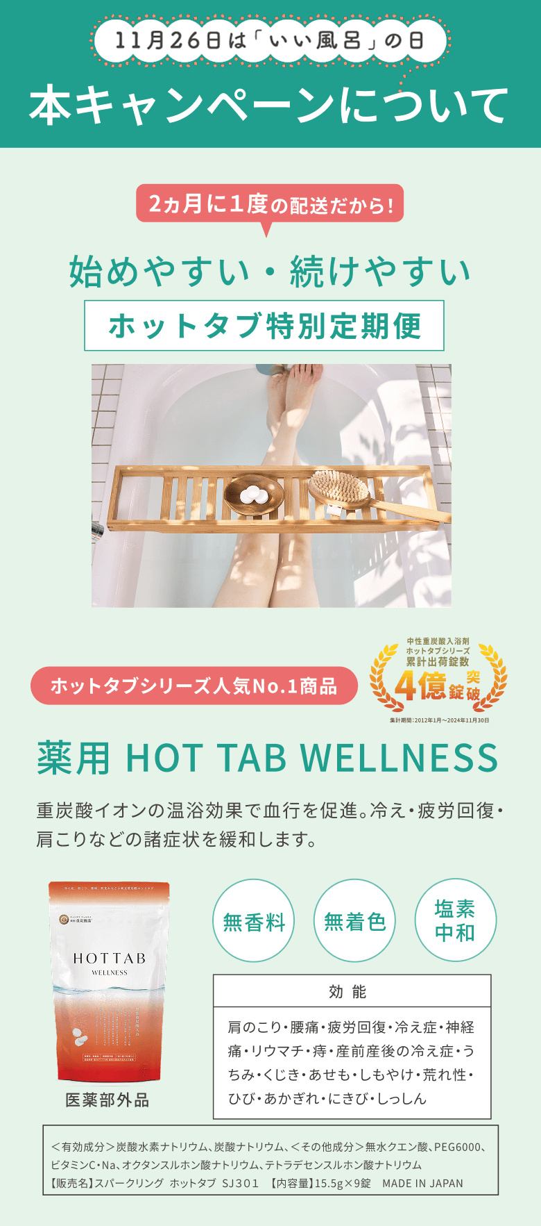 ホットタブ(医薬部外品)の溶けたお湯は中性pHで、重炭酸イオンが湯中に溶け込みます。重炭酸イオン(※有効成分:炭酸水素ナトリウム、炭酸ナトリウム)が温浴効果を高め血行を促進し、冷えなどの諸症状を緩和。湯上り後も温まり感が持続します。