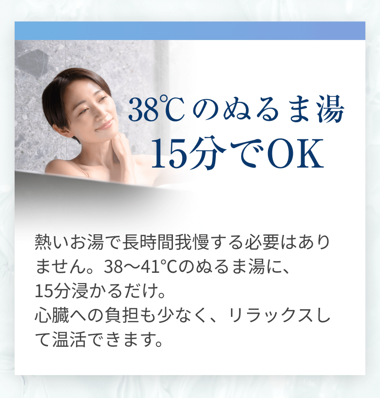 お風呂は夏は36℃の体温程度で、冬は41℃以下のぬるめのお湯に15分以上、最適なのは30分以上の長湯がおすすめです。