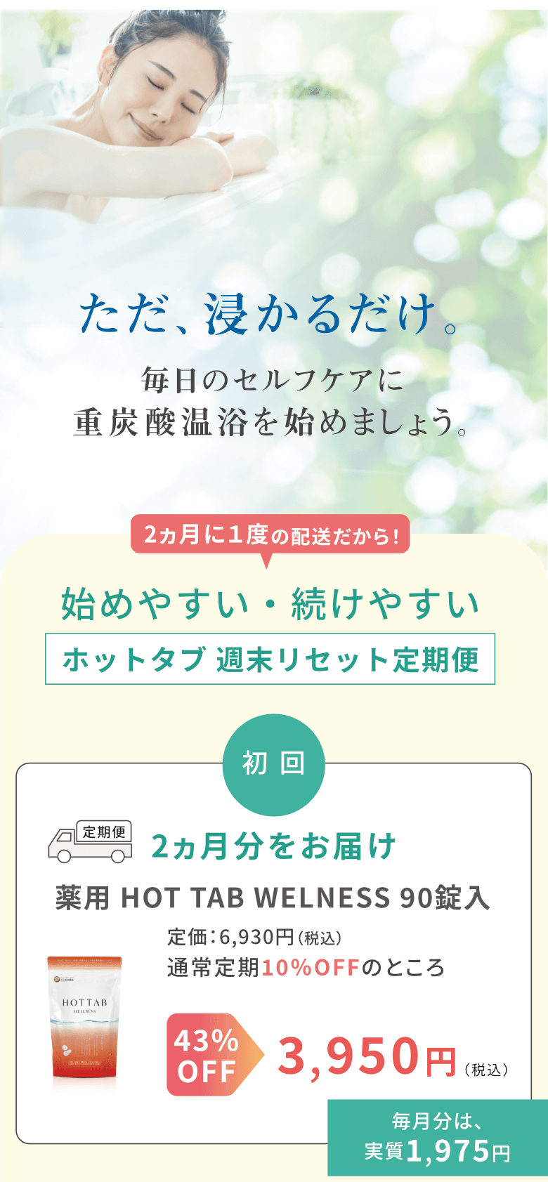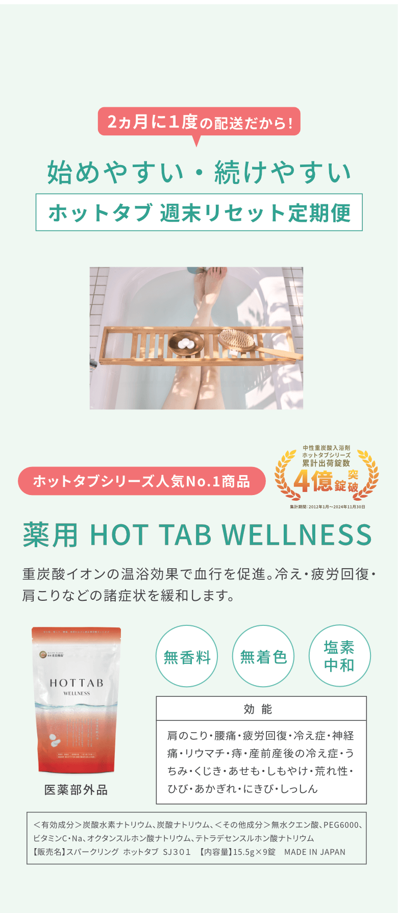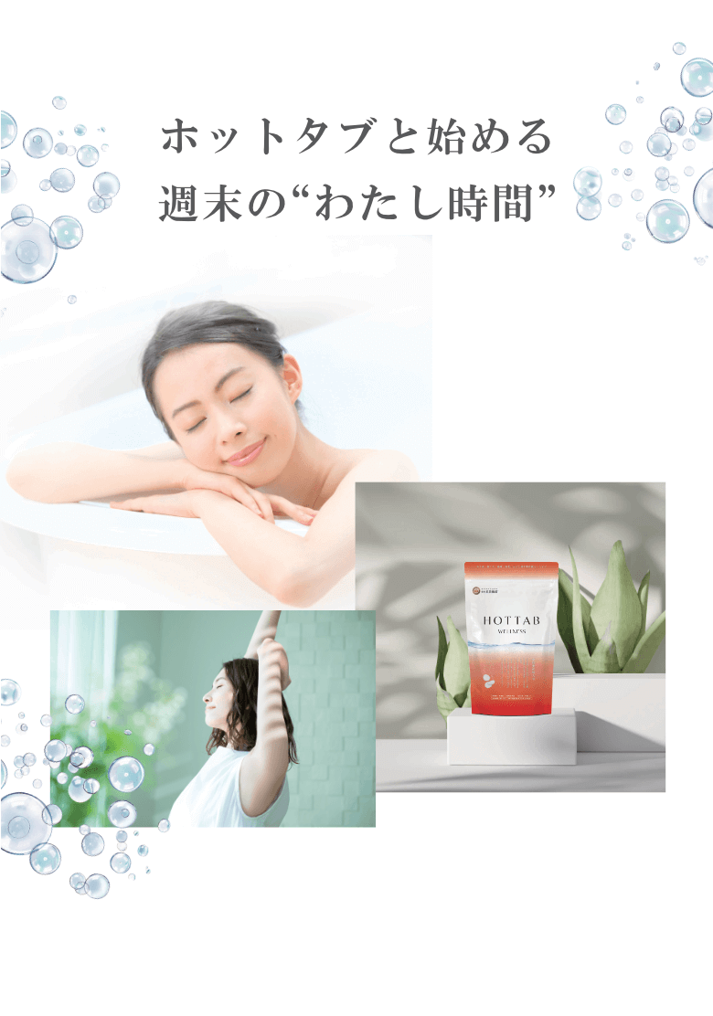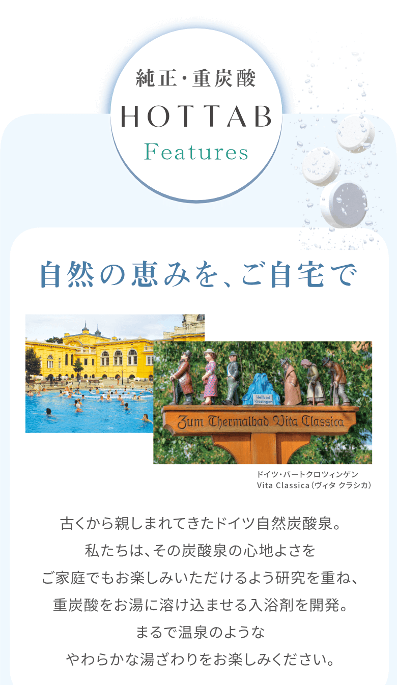 ホットタブ(医薬部外品)の溶けたお湯は中性pHで、重炭酸イオンが湯中に溶け込みます。重炭酸イオン(※有効成分:炭酸水素ナトリウム、炭酸ナトリウム)が温浴効果を高め血行を促進し、冷えなどの諸症状を緩和。湯上り後も温まり感が持続します。