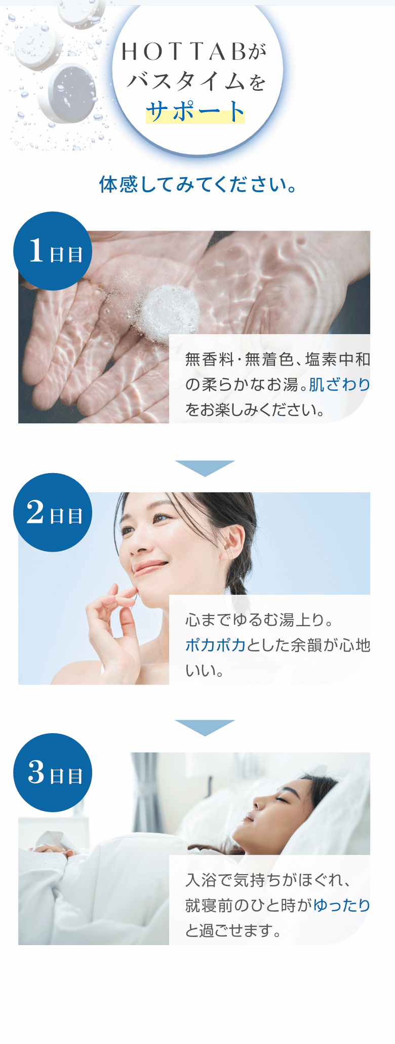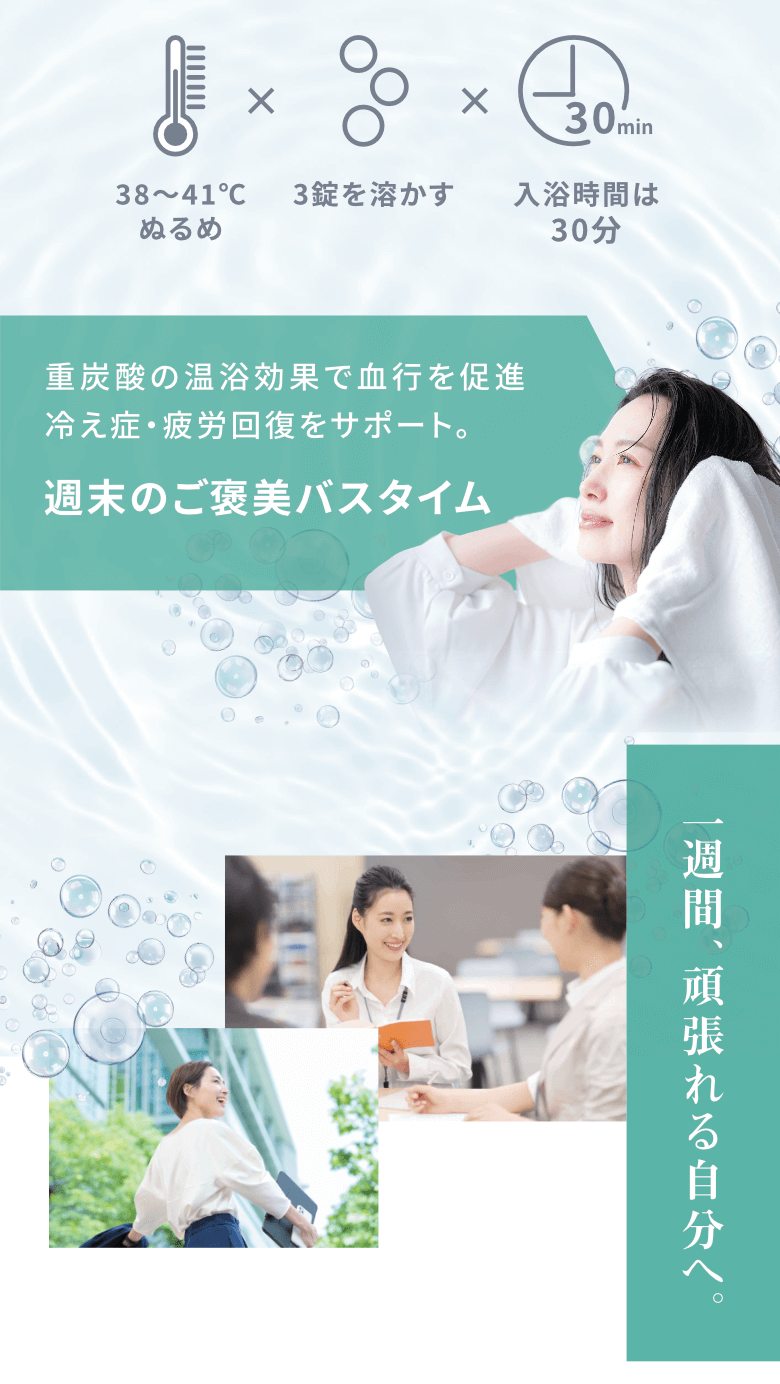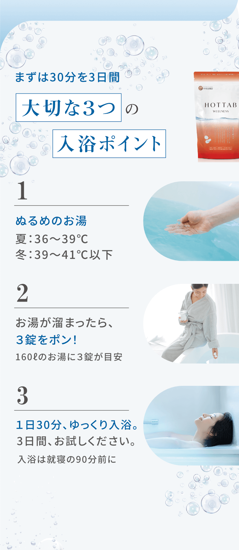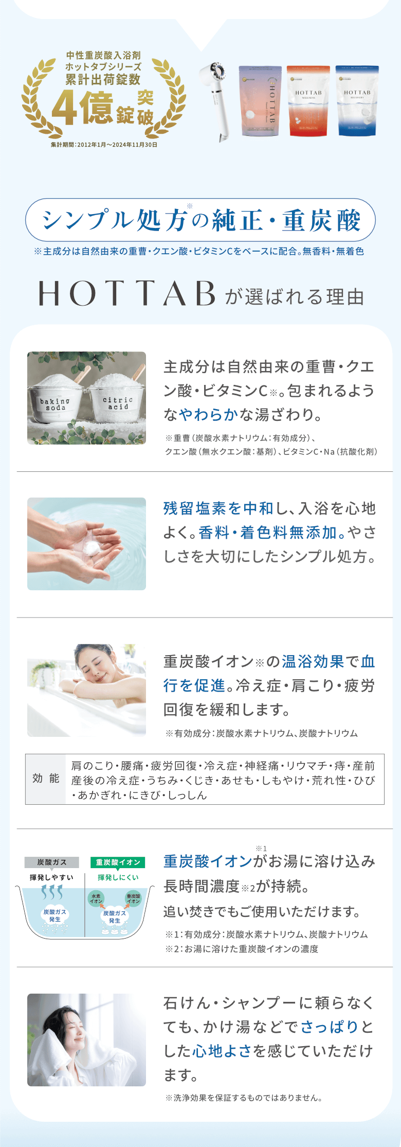 ホットタブ(医薬部外品)の溶けたお湯は中性pHで、重炭酸イオンが湯中に溶け込みます。重炭酸イオン(※有効成分:炭酸水素ナトリウム、炭酸ナトリウム)が温浴効果を高め血行を促進し、冷えなどの諸症状を緩和。湯上り後も温まり感が持続します。