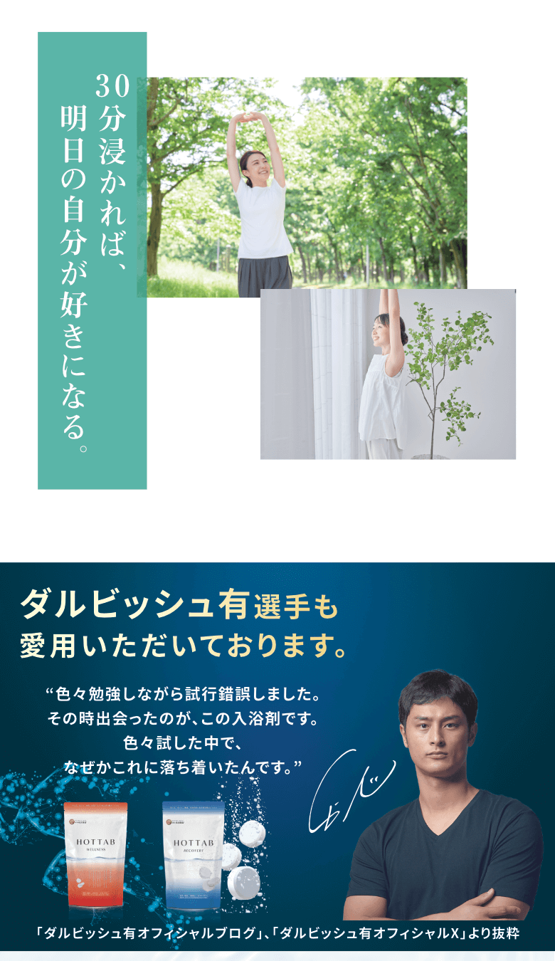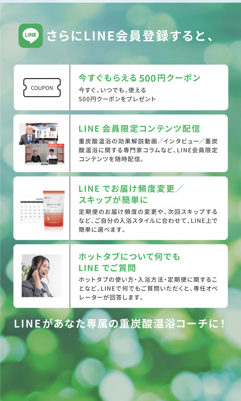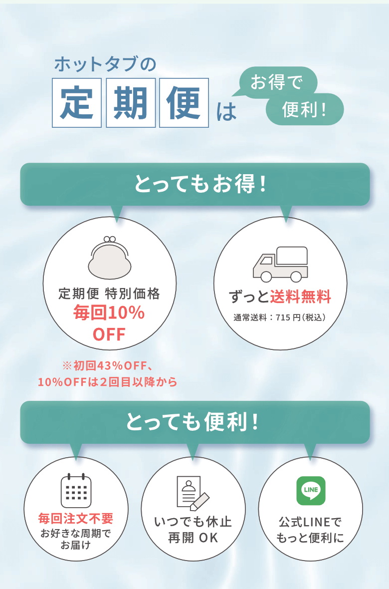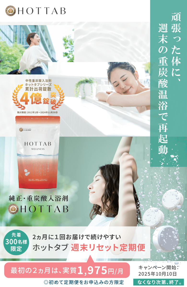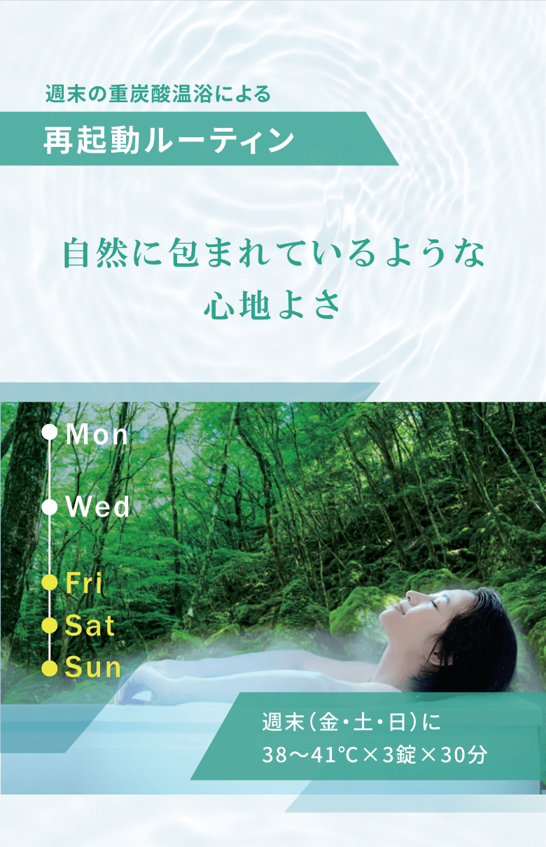 ホットタブ(医薬部外品)の溶けたお湯は中性pHで、重炭酸イオンが湯中に溶け込みます。重炭酸イオン(※有効成分:炭酸水素ナトリウム、炭酸ナトリウム)が温浴効果を高め血行を促進し、冷えなどの諸症状を緩和。湯上り後も温まり感が持続します。
