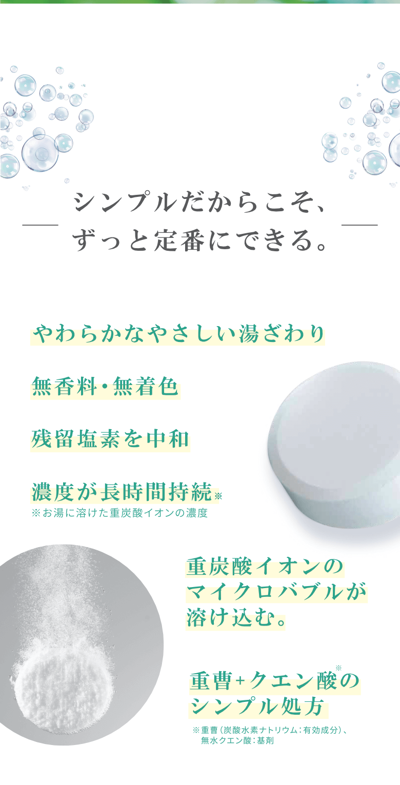 ホットタブは細かい泡でゆっくりと溶解するよう固く作られており、pH中性と相まって、より多くの重炭酸イオンを湯中に留まらせるよう設計されています。