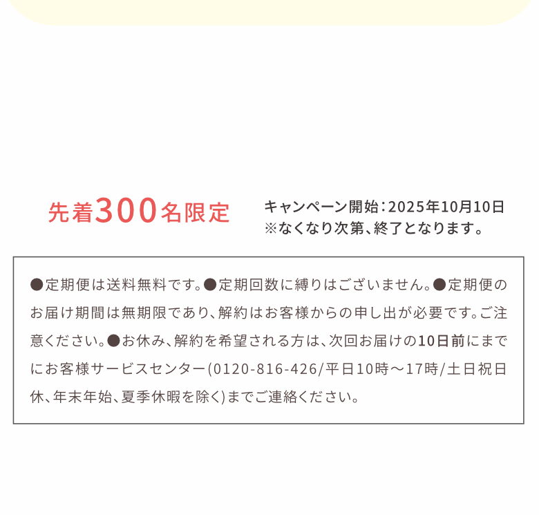 ・お休み・解約を希望される方は、次回お届けの10日前までにお客様サービスセンター(0120-816-426/10時~17時/土日祝日休、年末年始、夏季休暇を除く)までご連絡ください。 -