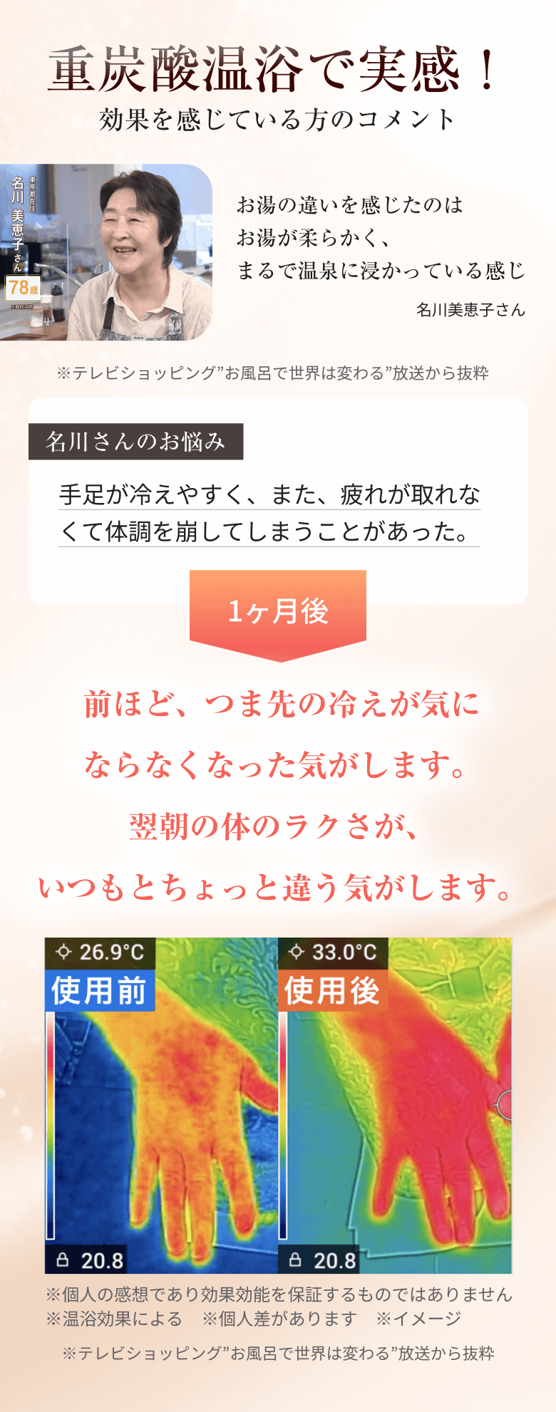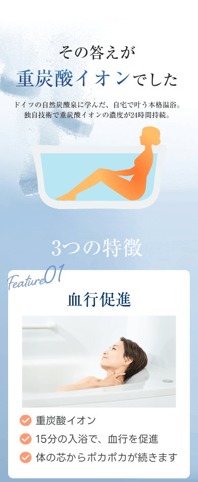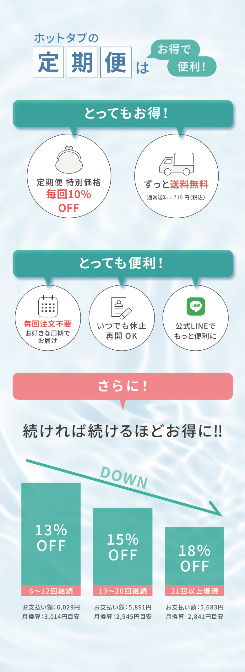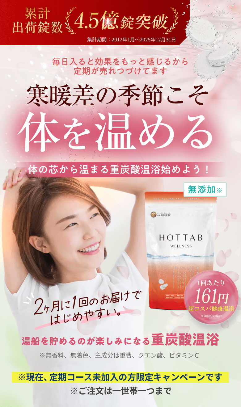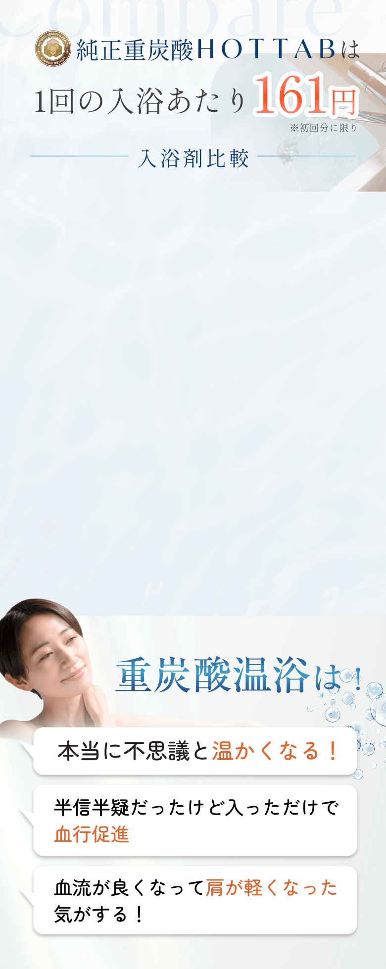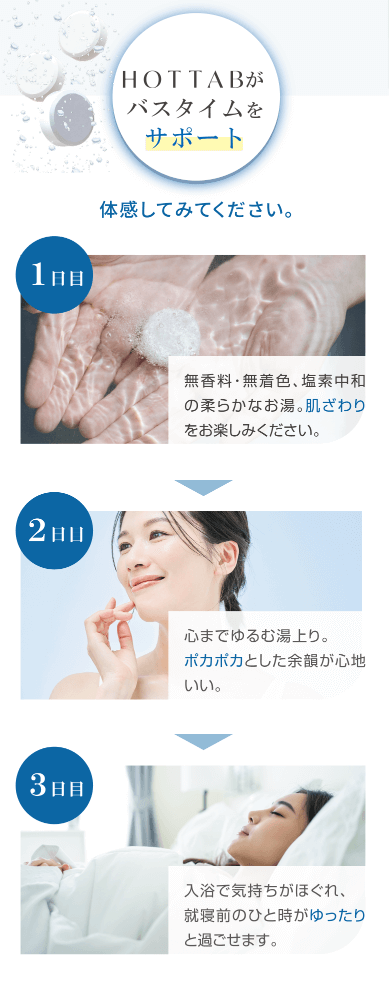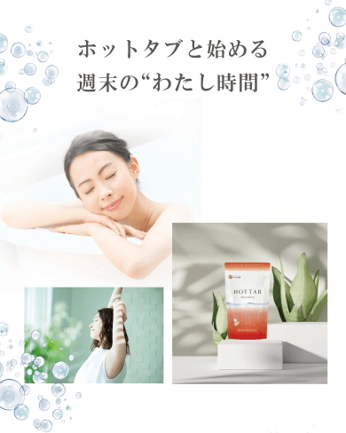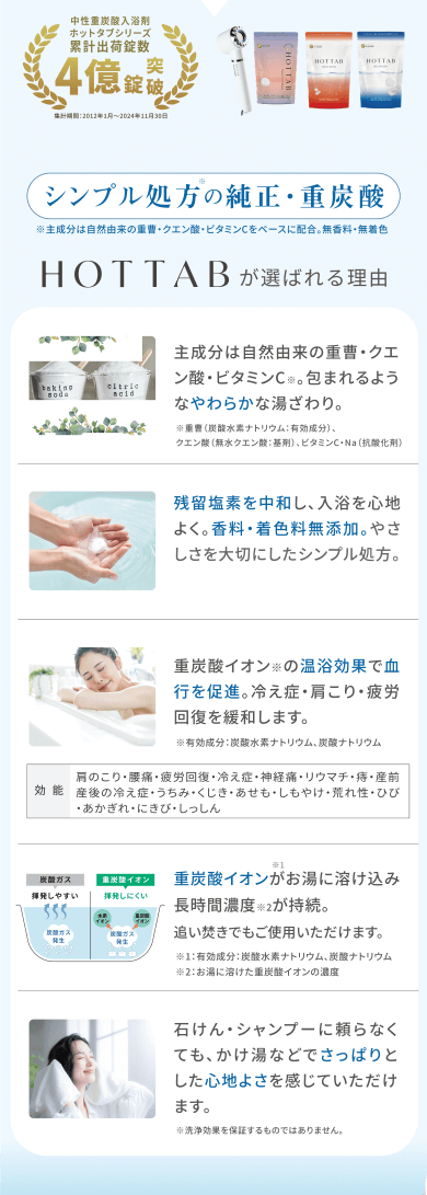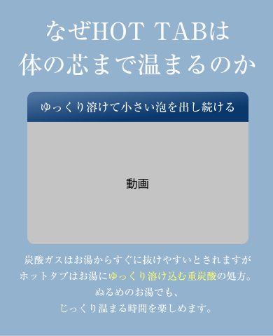 ホットタブ(医薬部外品)の溶けたお湯は中性pHで、重炭酸イオンが湯中に溶け込みます。重炭酸イオン(※有効成分:炭酸水素ナトリウム、炭酸ナトリウム)が温浴効果を高め血行を促進し、冷えなどの諸症状を緩和。湯上り後も温まり感が持続します。