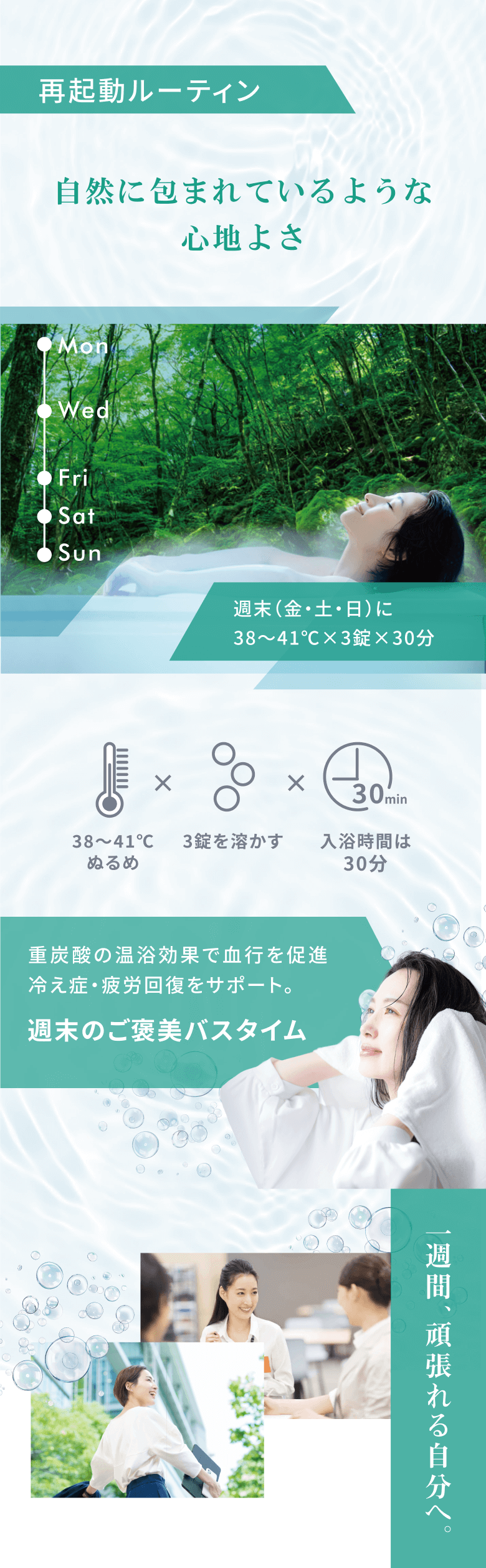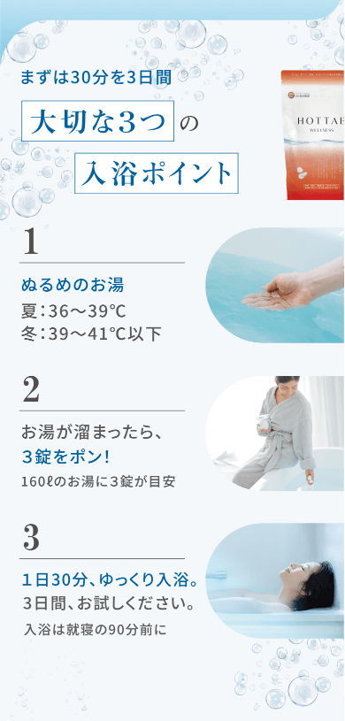 ・お風呂(160リットル)に対し、1回3錠を目安に溶かし、41℃以下のぬるめでゆっくり15分以上ご入浴ください。おすすめは30分以上の長湯です。