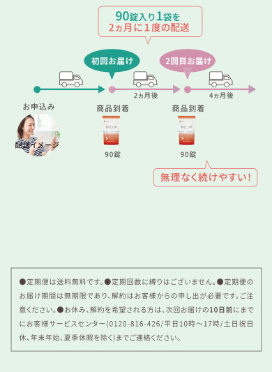 毎月の配送にご変更の際は、次回お届けの10日前までに公式LINEまたはお客様サービスセンター(0120-816-426/10時~17時/土日祝日休、年末年始を除く)までご連絡ください。