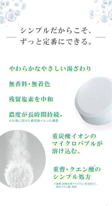 ホットタブは細かい泡でゆっくりと溶解するよう固く作られており、pH中性と相まって、より多くの重炭酸イオンを湯中に留まらせるよう設計されています。