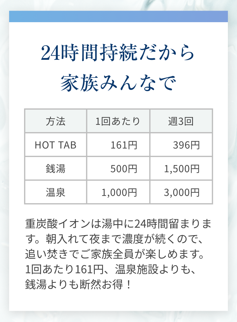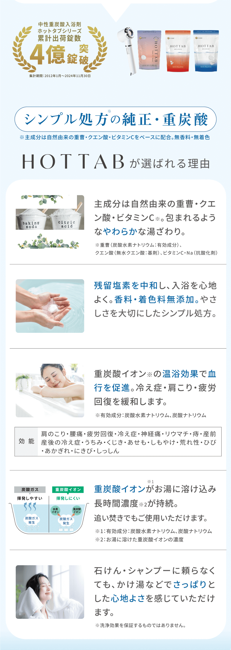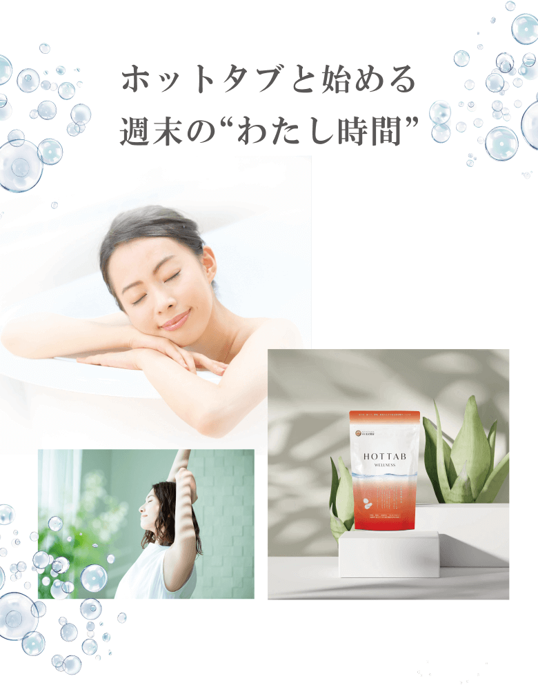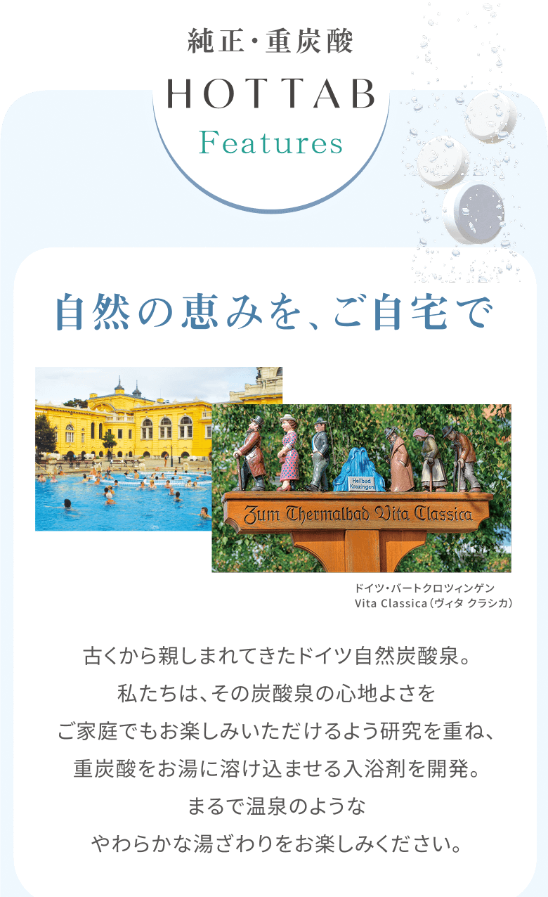 ホットタブ(医薬部外品)の溶けたお湯は中性pHで、重炭酸イオンが湯中に溶け込みます。重炭酸イオン(※有効成分:炭酸水素ナトリウム、炭酸ナトリウム)が温浴効果を高め血行を促進し、冷えなどの諸症状を緩和。湯上り後も温まり感が持続します。