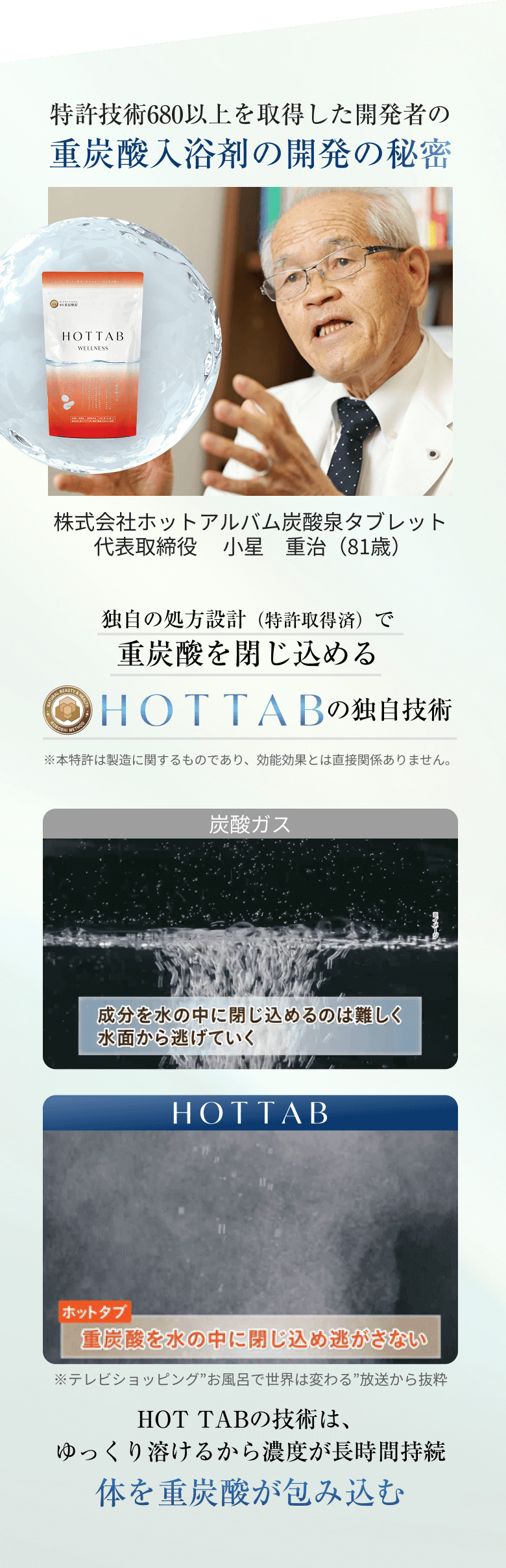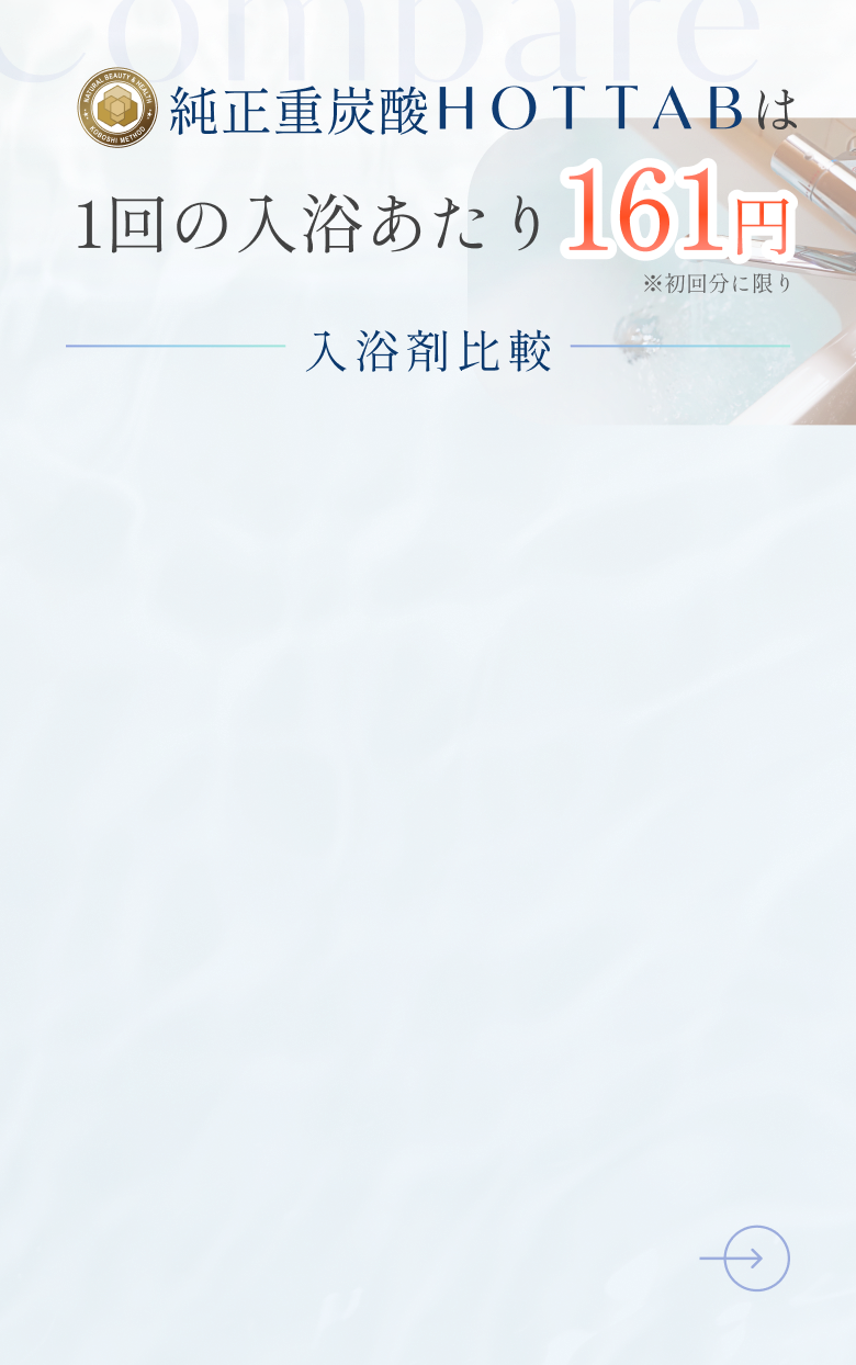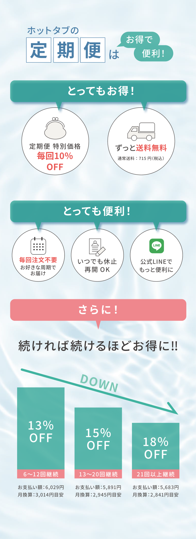 ホットタブ(医薬部外品)の溶けたお湯は中性pHで、重炭酸イオンが湯中に溶け込みます。重炭酸イオン(※有効成分:炭酸水素ナトリウム、炭酸ナトリウム)が温浴効果を高め血行を促進し、冷えなどの諸症状を緩和。湯上り後も温まり感が持続します。