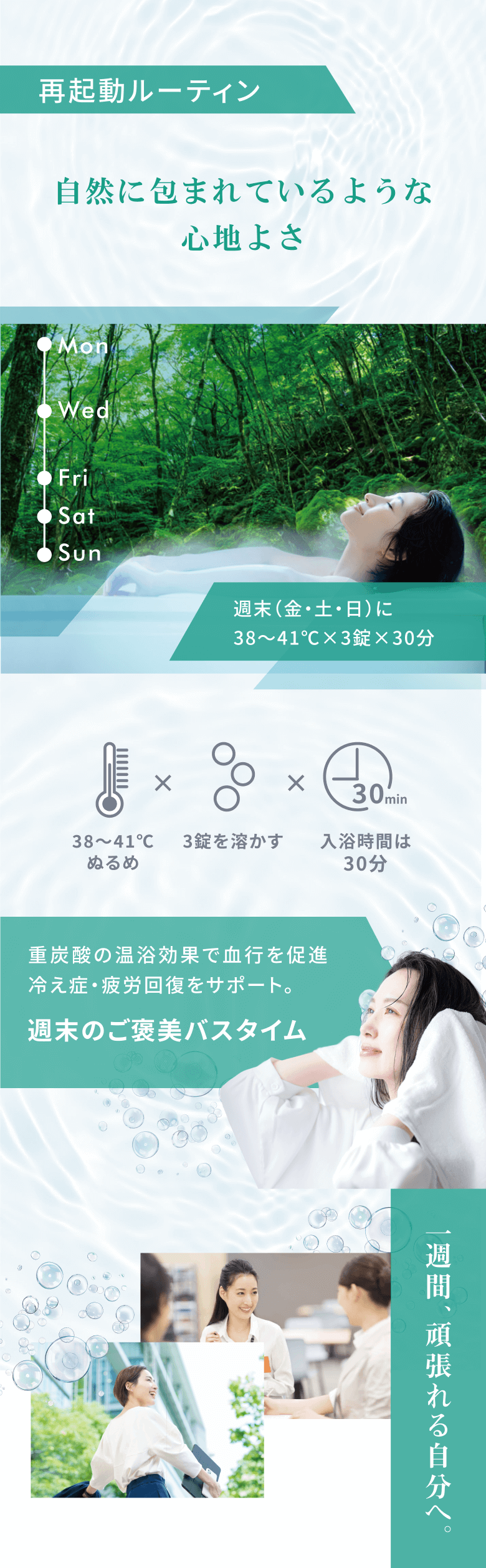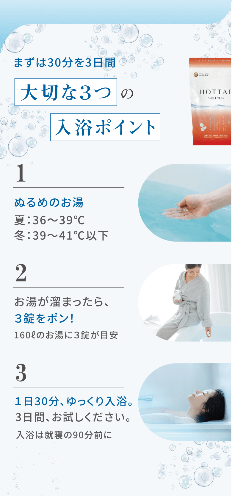 ・お風呂(160リットル)に対し、1回3錠を目安に溶かし、41℃以下のぬるめでゆっくり15分以上ご入浴ください。おすすめは30分以上の長湯です。