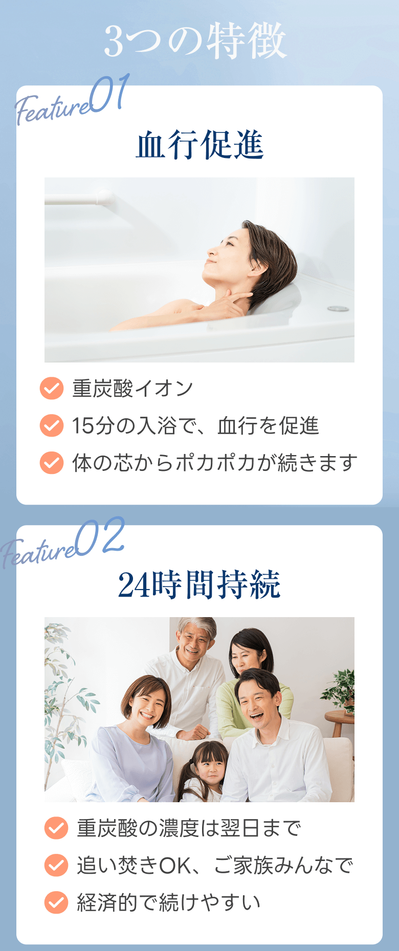 有効成分が温浴効果を高め血行を促進し、冷え症・肩こり・腰痛・神経痛など17の諸症状を緩和します。湯上り後も温まり感が持続。長時間濃度が持続するため後から追い焚きしてもご家族でお楽しみいただけます。季節を問わず毎日の健康づくりにお役立てください。