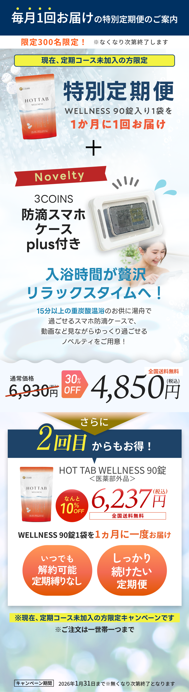 ※毎月お届けする定期便の初回キャンペーン価格( 30%OFFの4,850円 ※防滴スマホケース付き)、2回目から10%OFFの6,237円でのご提供となります。